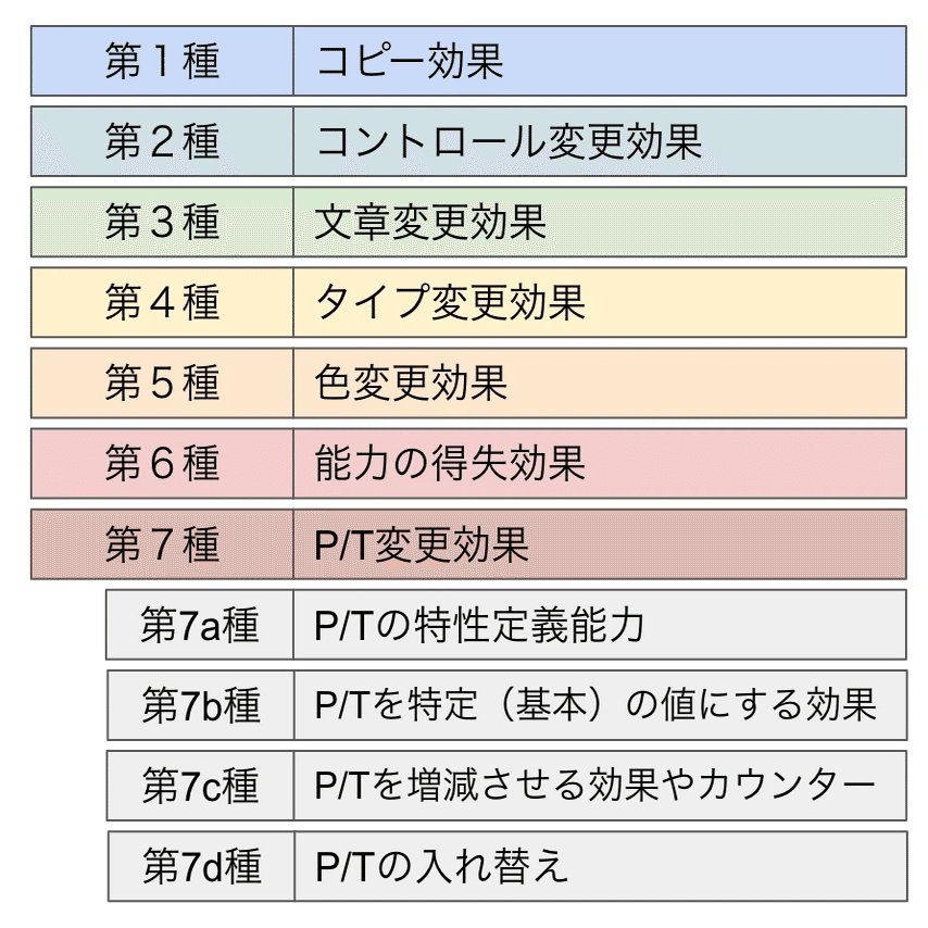 パーマネントなどオブジェクトの特性を変更する継続的効果は、以下の7種類に分類され、第1種から順番に適用されます。