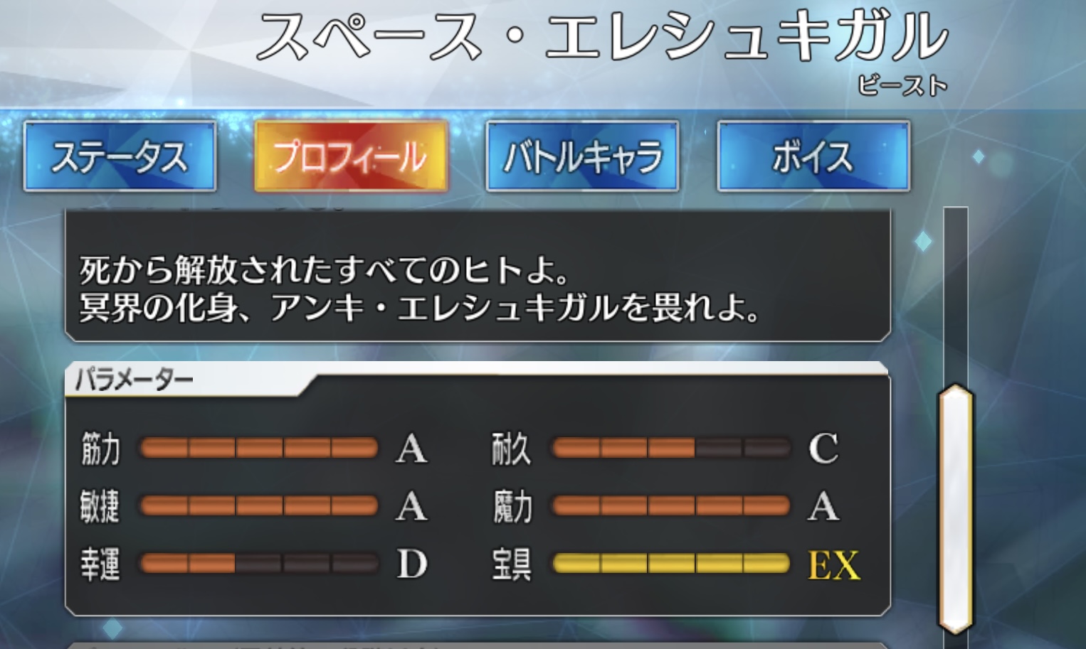 耐久:徹夜に強い、魔力:カス過ぎてEX、宝具:対神秘性能ヤベー奴。EXが残当…本当に残当か…?