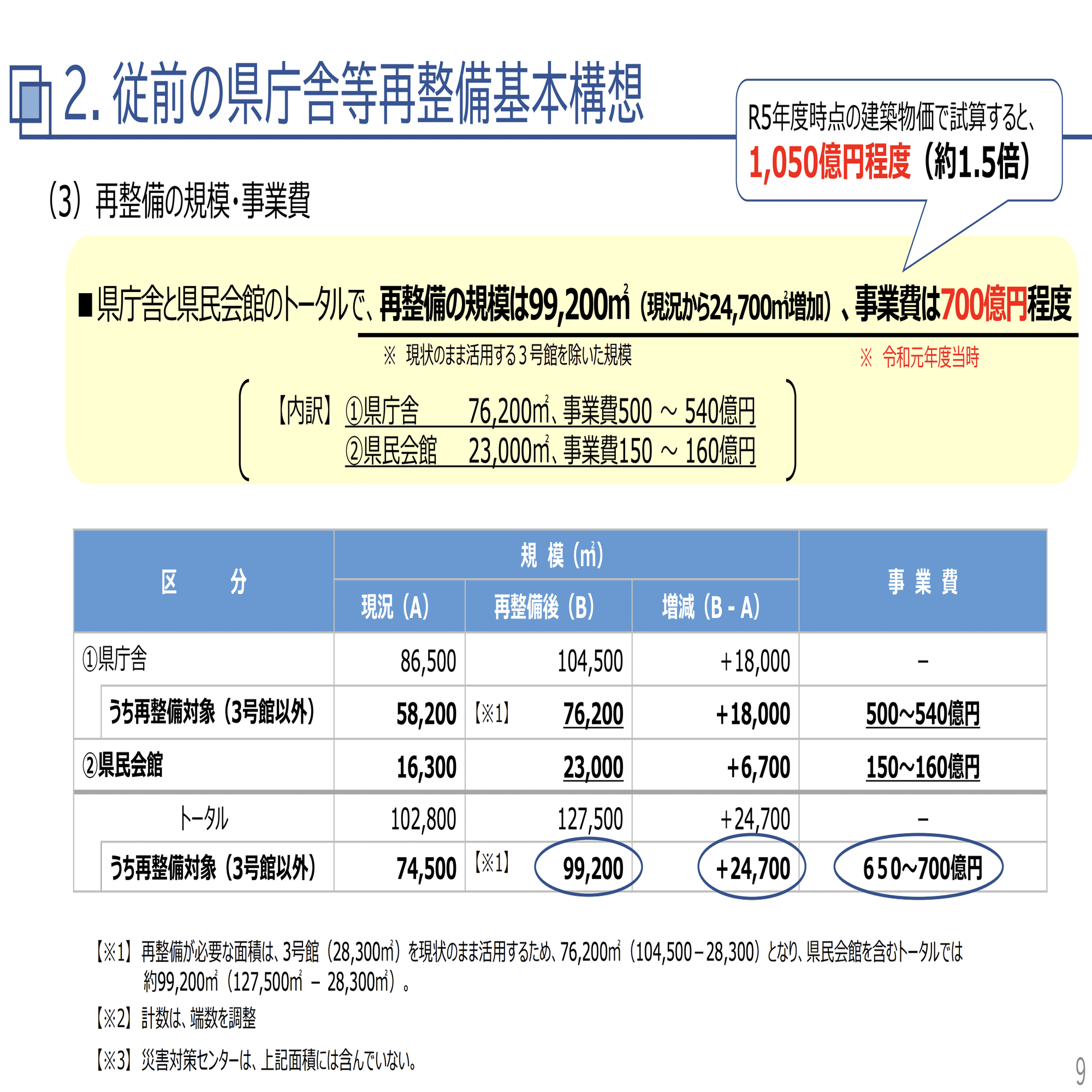 県庁舎(県民会館含む)だけで、今の物価で1050億円かかると見込まれており、元町周辺整備も含めると、どこまでかかるか、試算が公表されていません。