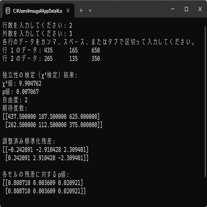このプログラムを「chi_square_test.py」などの名前で保存しておいてください。Pythonと必要なモジュール(NumPy, SciPy, reなど)がインストールされていれば、ファイルのアイコンをダブルクリックするだけでプログラムが起動します。