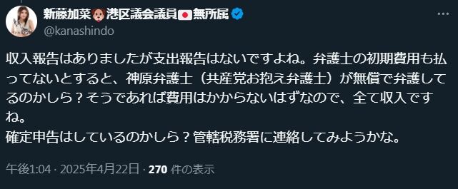 新藤加菜「神原元は共産党お抱え弁護士」「無償で弁護してカンパは全て収入」などデマ妄想を垂れ流す【名誉毀損】