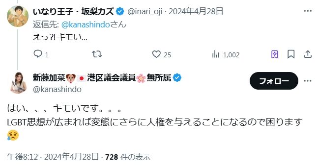 - 新藤加菜が、同性婚や夫婦別姓を求める人を「日本を壊そうとする侵略者」だと中傷していること。