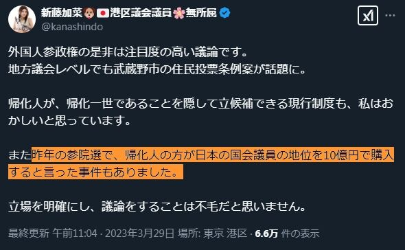 #新藤加菜「帰化人が国会議員の地位を10億円で購入」とデマを流す:元ネタはまたもや立花孝志
