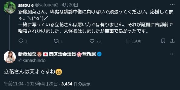 - 新藤加菜、「チョン」「支那」「朝鮮人は私に話しかけるな」といった差別的発言について、「自分の発言ではなく、第三者による捏造だ」と裁判所で虚偽の主張を行ったが、インターネット上のアーカイブを提示され、最終的に自身の発言であることを認めたこと。「記憶にない」と述べるなど、ある意味政治家らしい対応を見せたこと。