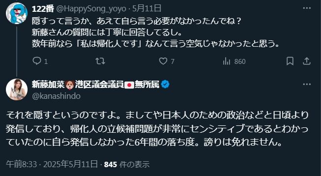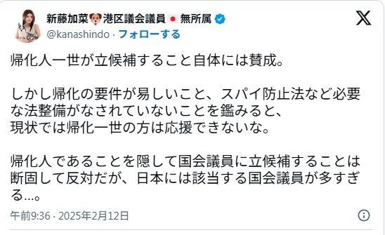 - 出自だけで「応援できない」と言いながら「出自をオープンにして堂々と戦え」と求める新藤加菜の主張が、論理的に矛盾していること