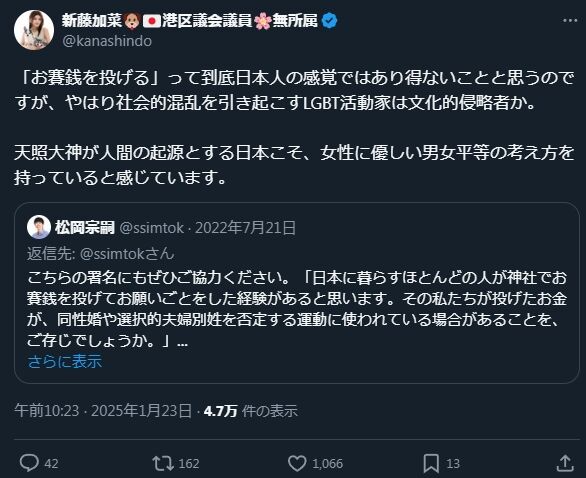 - 同性婚や夫婦別姓でどういう理屈で戸籍が壊れるのか説明もせず、同性婚や夫婦別姓を求める人を侵略者扱いする新藤加菜は、公人として絶対的に不適格な人物であること。