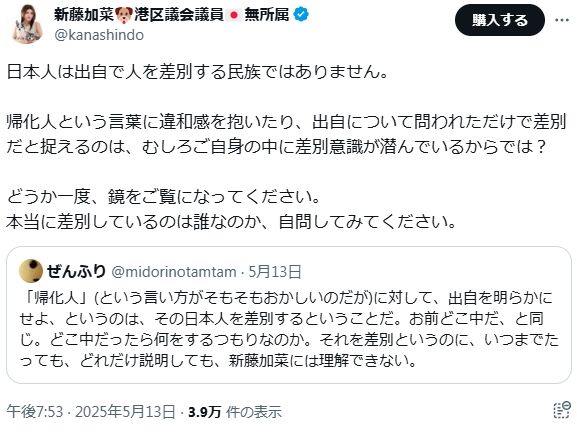 - 新藤加菜が「帰化人」への差別的発言を繰り返しながらも、自身ではそれを差別と認識していないこと