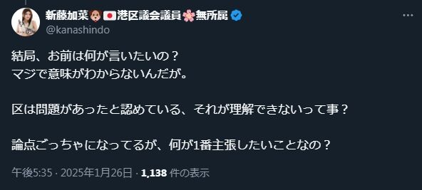 - 正しい情報発信ができず、自分に都合のいいように解釈して事実を捻じ曲げる新藤加菜は、絶対的公人不適格人材である。