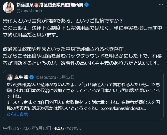 - 新藤加菜は帰化人の言論の自由を認めない差別主義者であること。