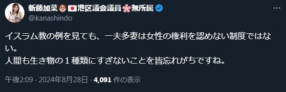 ご都合主義! 新藤加菜、イスラム教を根拠に一夫多妻を主張しながら、中韓を根拠に夫婦別姓は否定