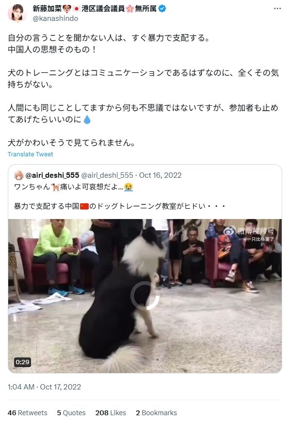 - 新藤加菜が、「大型連休で日本に来た中国人が憎悪を持って犬を蹴り殺す」などと何一つ根拠のない妄想で中国人ヘイトを煽るレイシストであること。