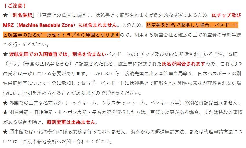 ↓在NY日本領事館HPにも、たとえパスポートに旧姓が併記されていても、「航空券を別名(旧姓)で取得した場合、トラブルの原因となります」とはっきりと書いてある。ググればわかることさえ調べる能力がなくデマを垂れ流す新藤加菜は公人完全不適格。