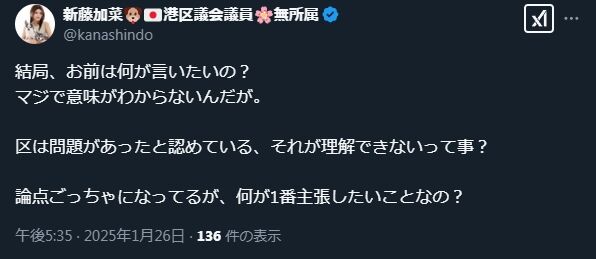 ↓「区は問題があったと認めている、それが理解できないってこと?」って、そんな事実は新藤の脳内にしかないのだから、理解できなくて当然である。理解できる方がおかしい。