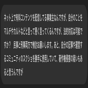 「マルチ」「カルト」などと中傷され、それによってあなたの有料コンテンツ販売やコミュニティの信用・売上が損なわれた場合、業務妨害罪や信用毀損罪の可能性があります。