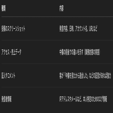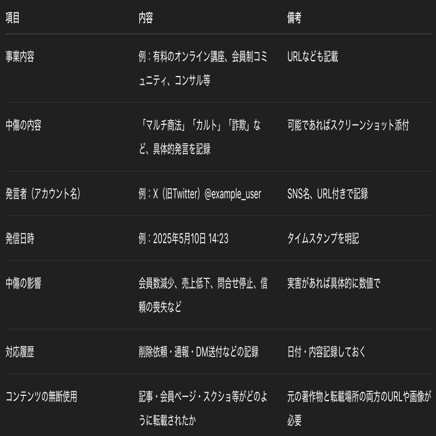 項目内容投稿された媒体例:X(旧Twitter)/YouTube/note該当投稿のURLhttps://example.com/xxx発信者(アカウント名)例:@malicious_user123発信日時2025年〇月〇日 〇時〇分違法性の概要「この人はマルチ商法」「カルト的な勧誘をしている」「詐欺まがい」等の表現により、当方の信用・業務が明確に毀損されました。また、当方が運営する有料会員コミュニティの内部画面を無断転載しており、著作権侵害の疑いもあります。