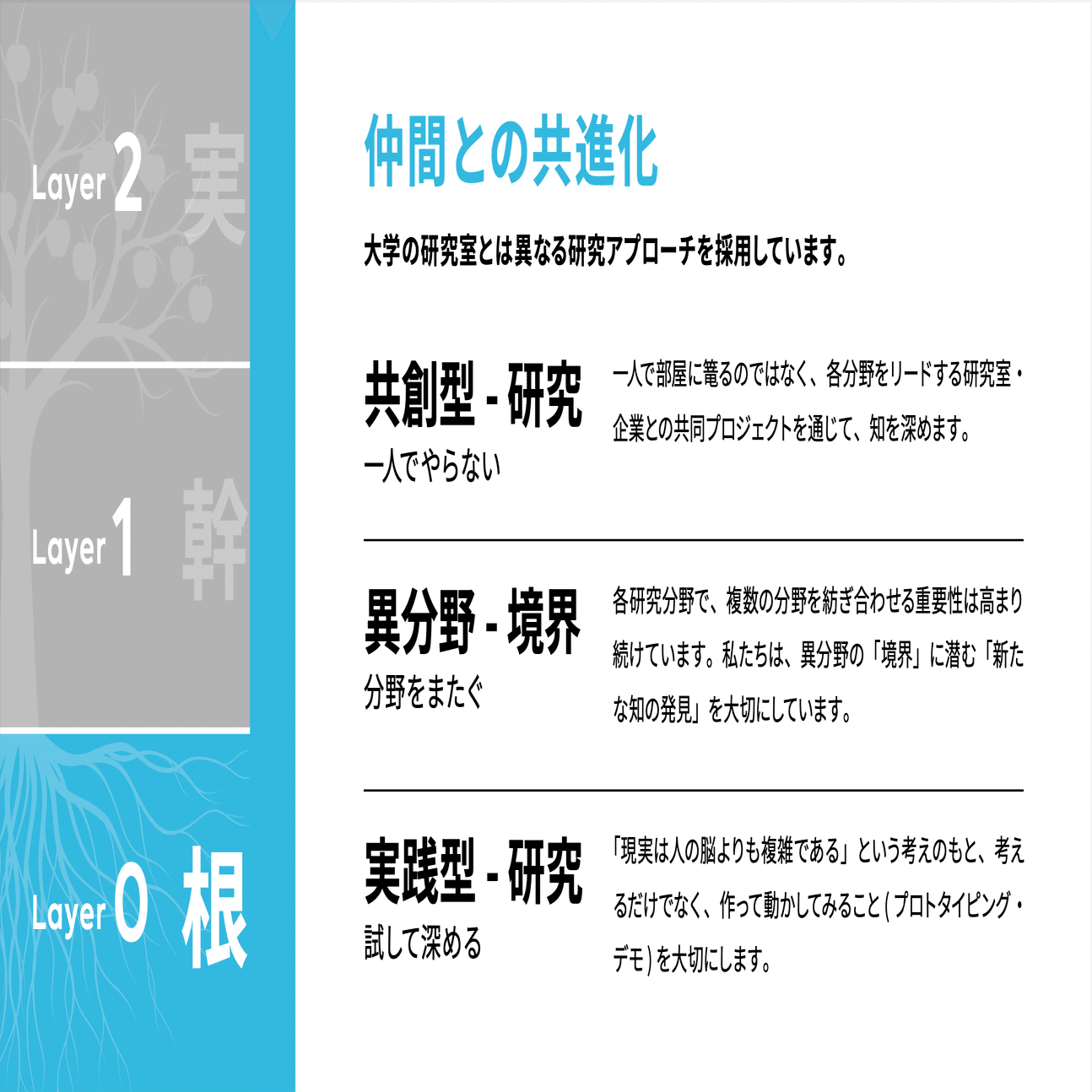 内藤:全社にいろいろな情報をシェアして、みんなを巻き込んでいく人です。PKSHAには、お互いが持つプロフェッショナルな部分を学び合う文化があります。その学び合ったことを自分のチーム内だけではなく、ほかの部署や事業部などにもシェアして巻き込んでいくことが大切だなと。というのも、Layer0〜2まで事業階層の概念があるPKSHAでは、今後ますますレイヤー間の連携が必要になるからです。そのとき、組織の“ハブ”となって越境し、異なる分野をつなげて新しいものをつくり出せる人は活躍できるでしょう。