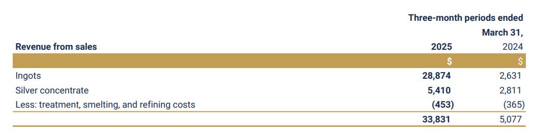 For the full year of 2024, Aya reported treatment, smelting, and refining costs of $3.0 million, representing 7.6% of total revenues. If we look at the Q1-25 numbers, those same costs amounted to $0.5 million, or approximately 1.3% of total revenues. As illustrated below, ingots represented ~85% of total revenues in Q1-25, and with the Zgounder mill still ramping up, ingot sales as a proportion of total sales should increase further in the coming quarters.