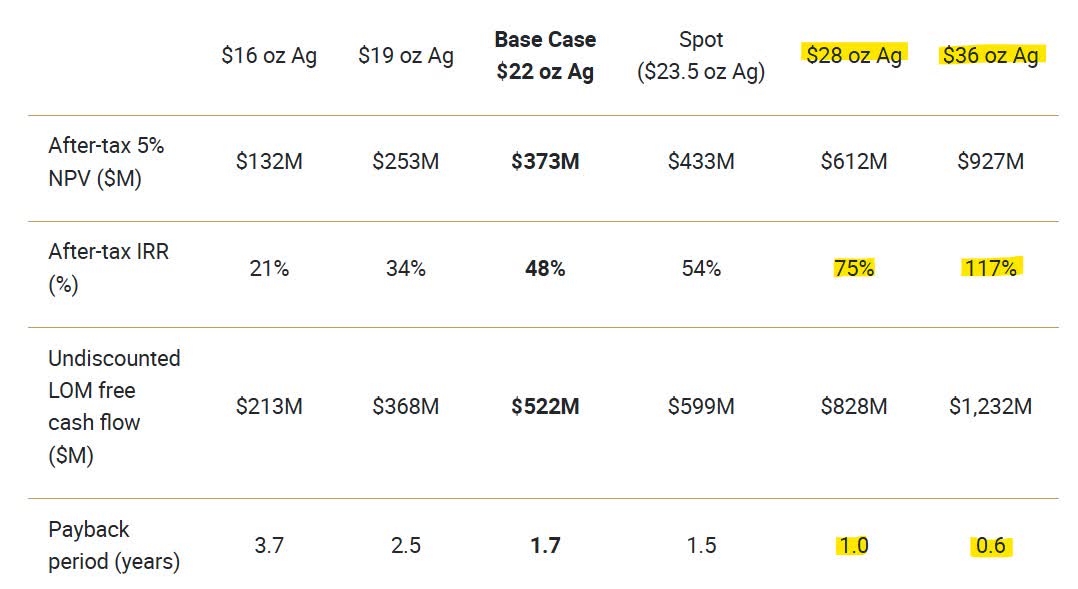 With low initial capital requirements and production costs, the payback period is expected to be around one year, with an after-tax internal rate of return estimated at 75% using a realistic silver price of $28.00 per ounce. As illustrated below, the project's after-tax IRR increases to 117%, and the payback period diminishes to just a few months using a silver price assumption of $36.00 per ounce.