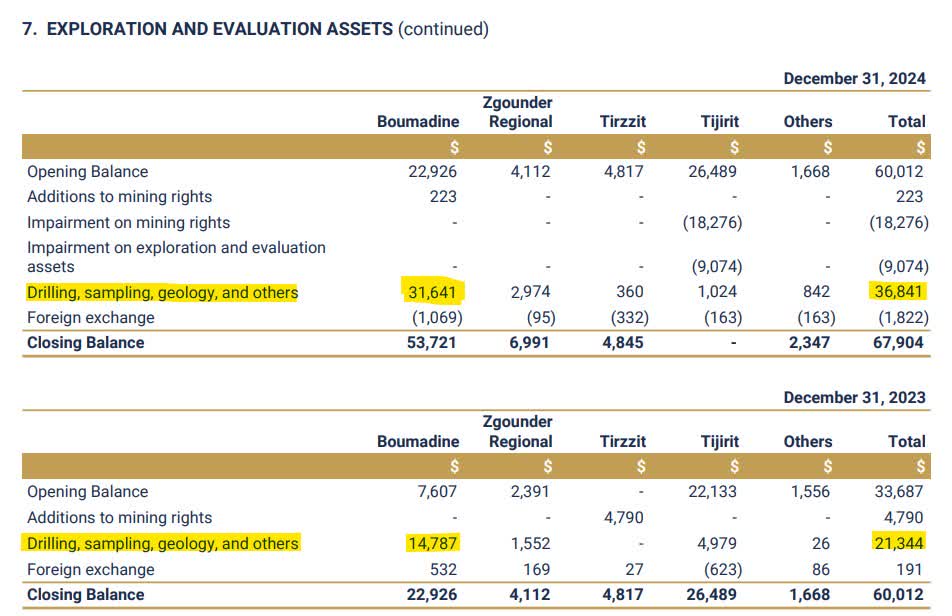 Over the last few years, Aya deployed a meaningful amount of capital to advance exploration on the property, notably with a 76,000-meter drilling program in 2023, followed by a 108,000-meter program in 2024. According to the company's guidance, another ~120,000-meter drilling program is planned for 2025. As illustrated below, Boumadine's drilling and other exploration expenses amounted to $14.8 million and $31.6 million in 2023 and 2024, respectively.