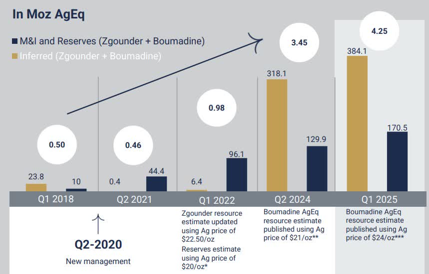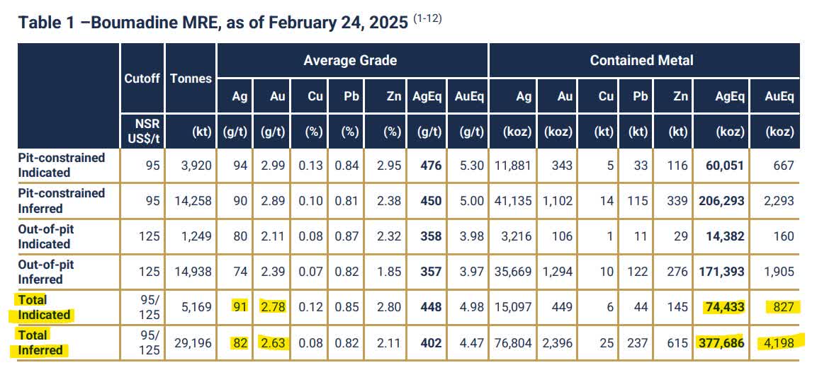 After investing almost $50 million in exploration over the last two years or so, Aya reported an updated mineral resource estimate on the project in February 2025. The revised estimates include 74.4 million silver-equivalent ounces in the indicated category and 377.7 million silver-equivalent ounces in the inferred category. Whether it is in the indicated or inferred categories, silver itself accounts for only 20% of total silver equivalent ounces, highlighting Boumadine's meaningful exposure to gold, lead and zinc.