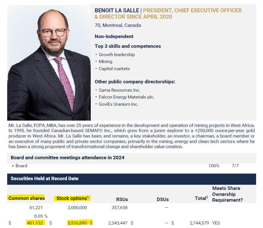 Just a few weeks later, in April 2020, Mr. La Salle was appointed as Aya's president and CEO. Following Aya's reorganization and SEMAFO's buyout, many former SEMAFO executives joined Aya's team. In a way, Aya's story in Morocco could be seen as a sequel to SEMAFO's story in West Africa, a kind of SEMAFO 2.0. However, I was surprised to discover that Mr. La Salle owns only ~60,000 shares of the company he leads, which is quite small relative to his 2.0 million stock options and ~360,000 RSUs.