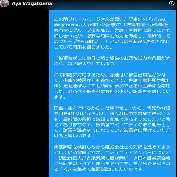 水面下の出来事ですが、SBI証券では被害額の大きいお二人(声揚集団の方と5000万失った方)が集団訴訟にかなり前向きで、楽天証券の方も9人ぐらい集まっていて集団訴訟の予定までいって、マスコミによい弁護士がいないか訪ねたり、Bloombergに被害者の人集めの記事が投稿されようとしておりました。