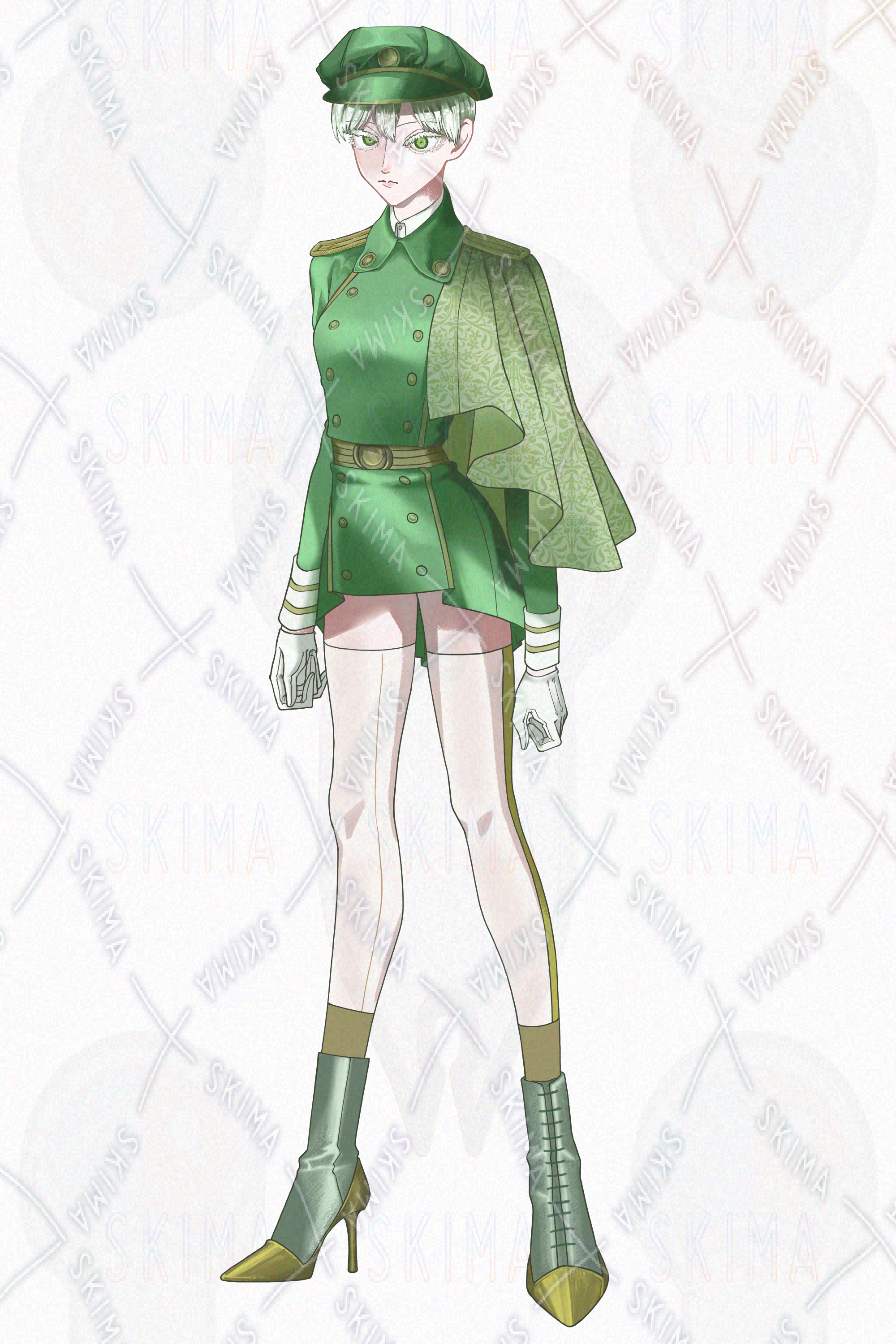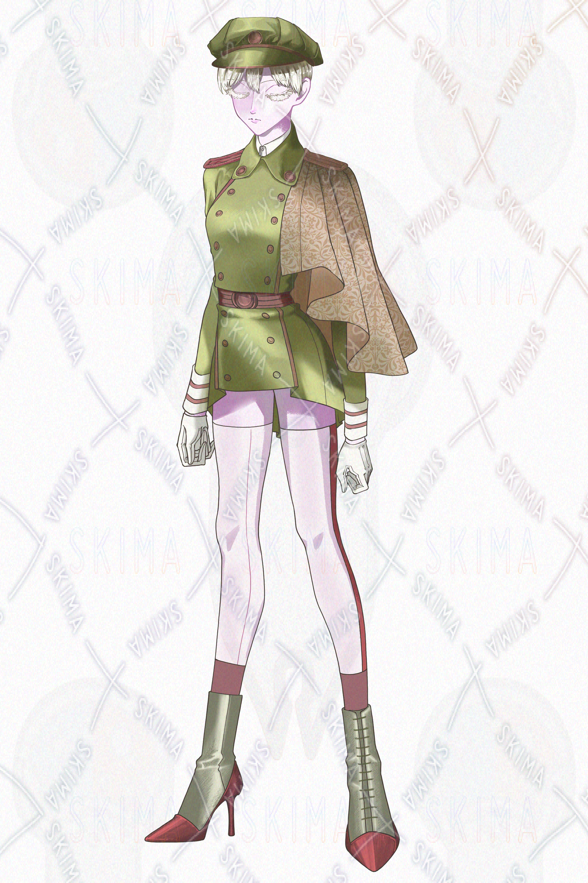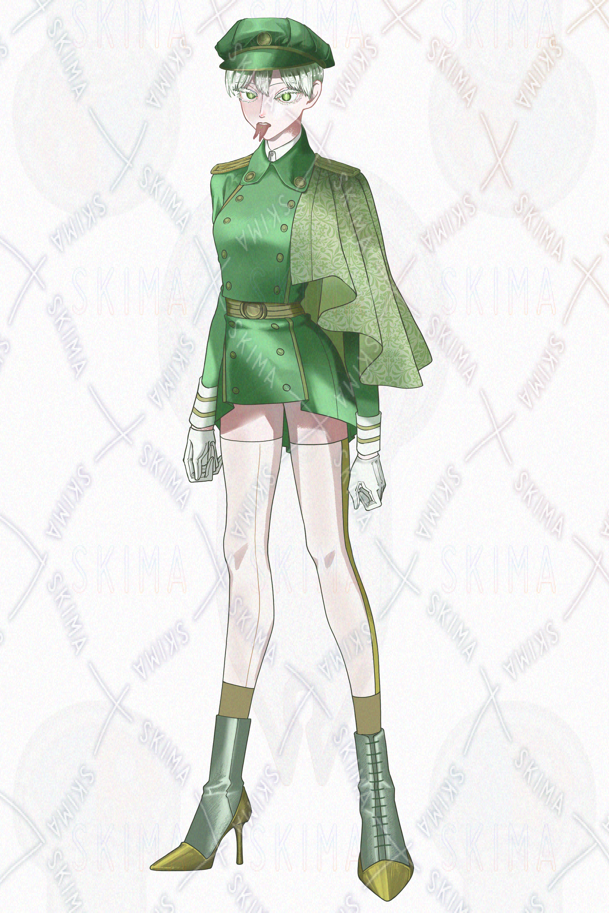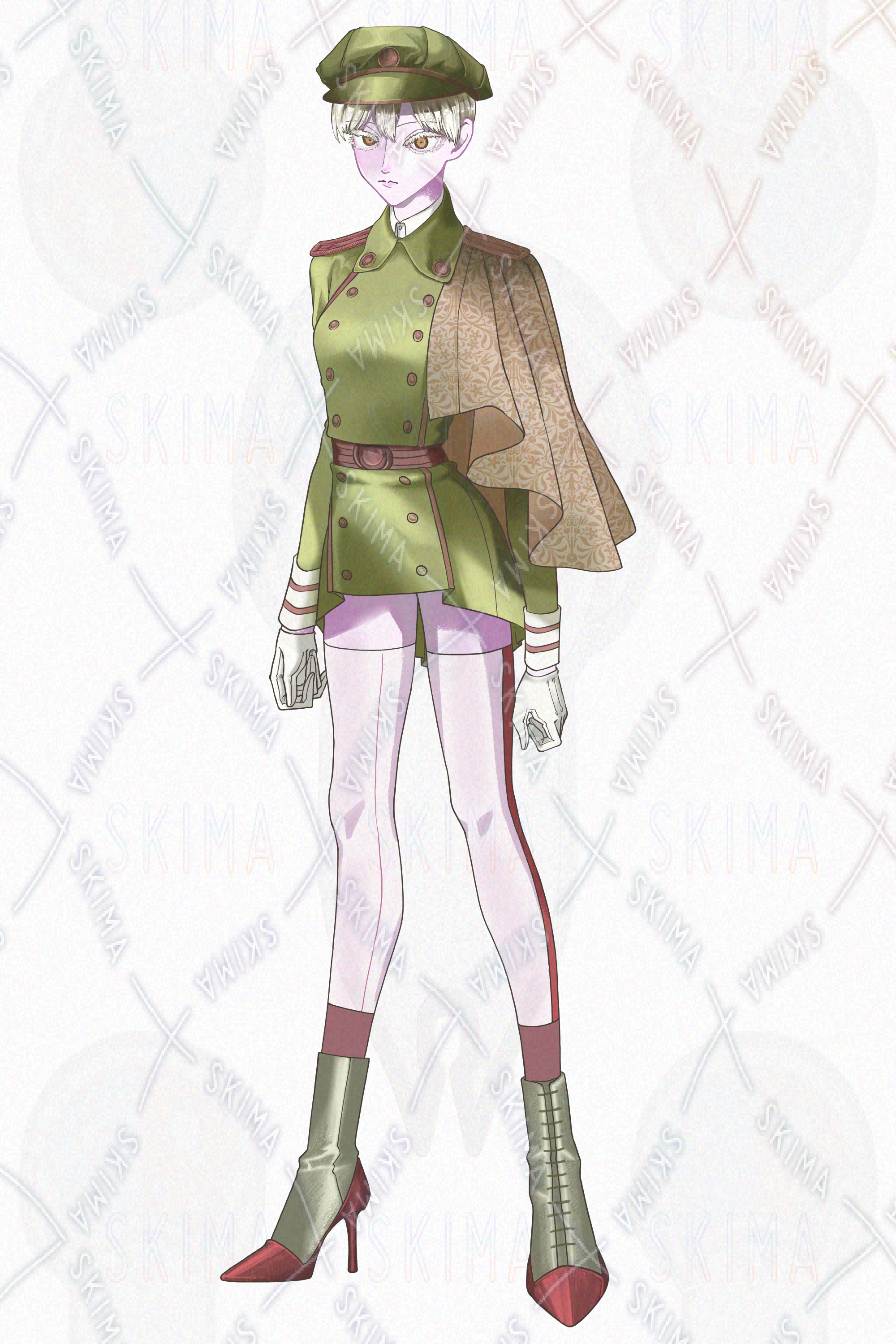 キャラクターデザイン/ミリタリー/レトロ/短髪/白髪/軍帽/蛇/スプリットタン/手袋/サイドライン/タイツ/ブーツ/濃緑/枯葉色/2Pカラー