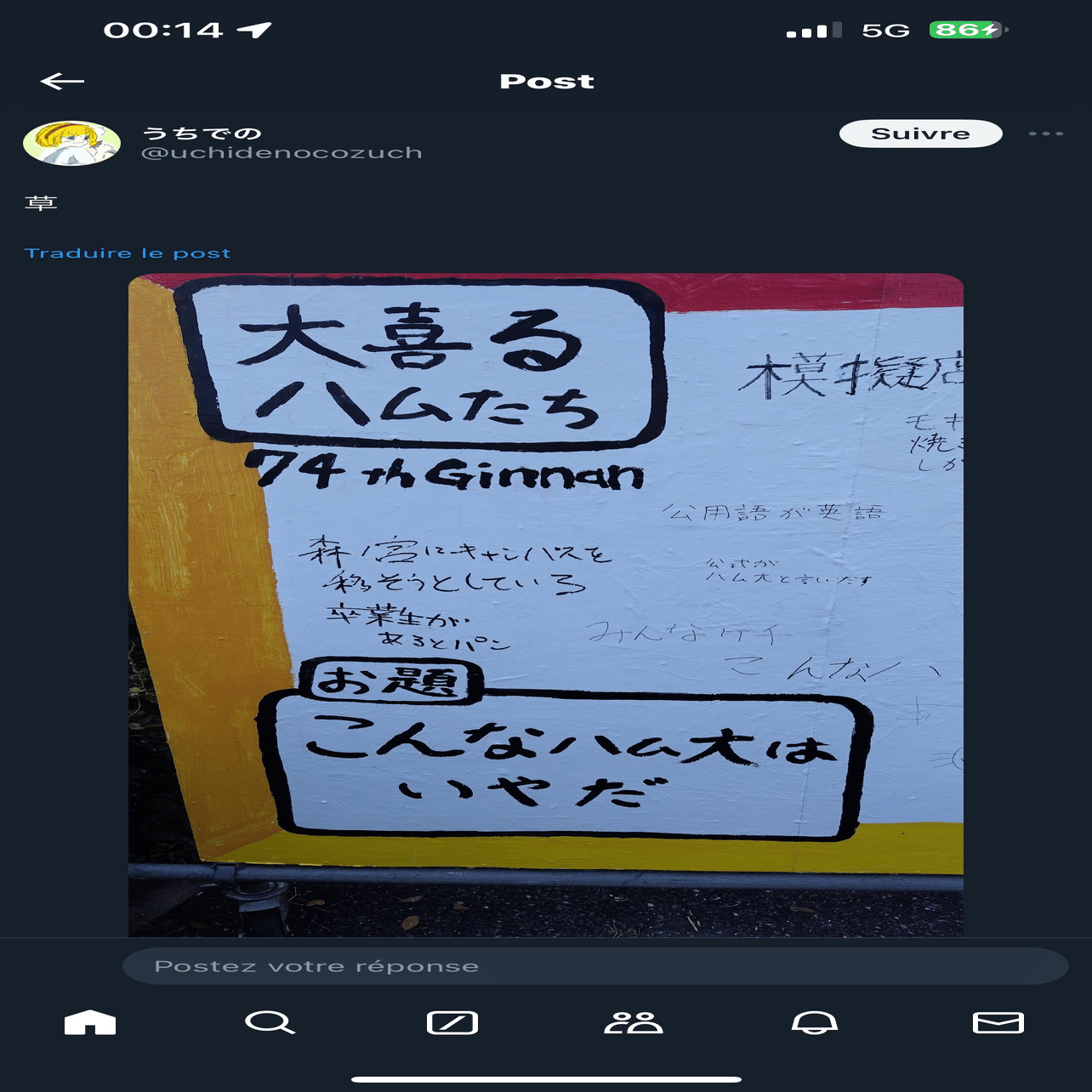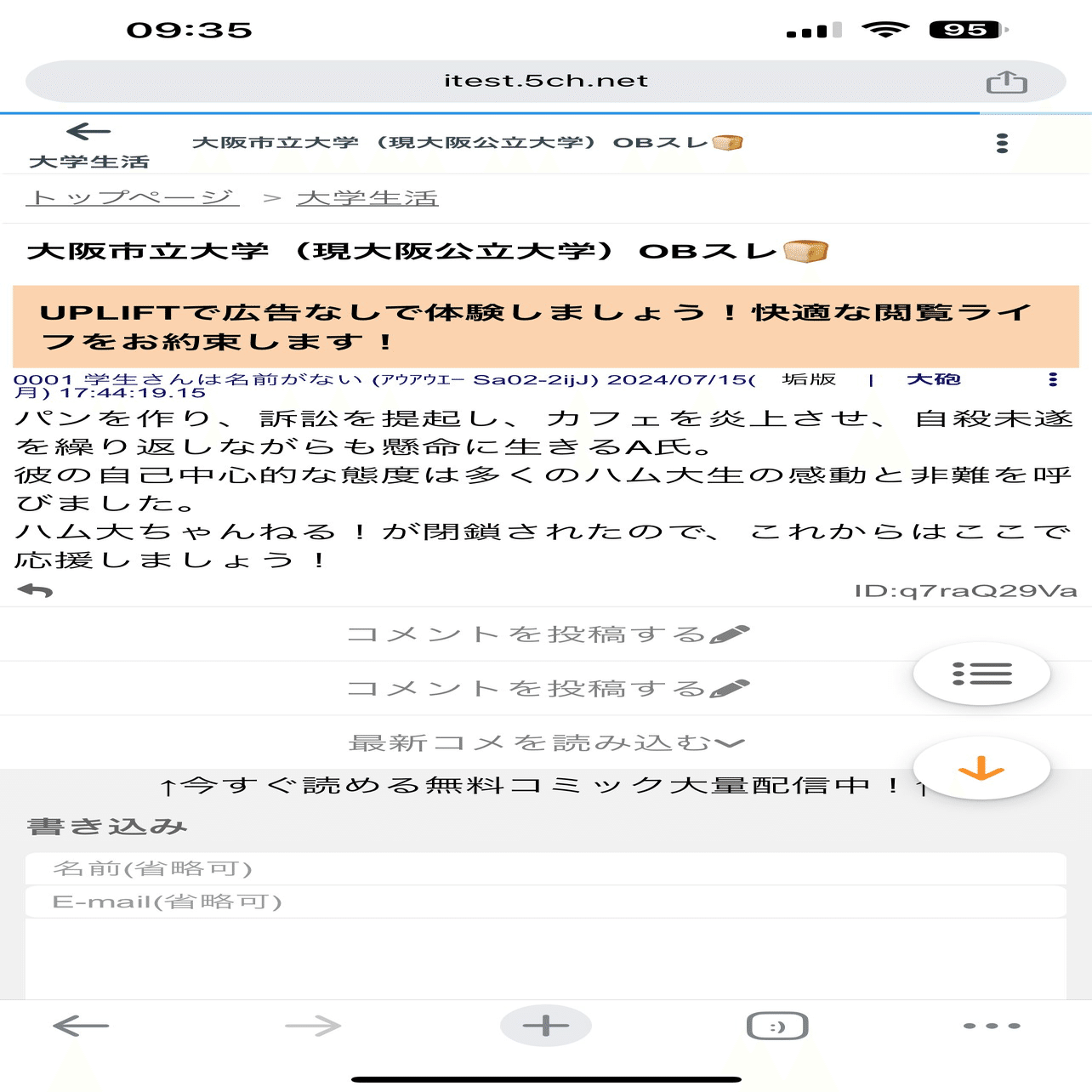 ここでlaw害氏が触れている「掲示板」とは、大阪公立大学の学生が運営している掲示板サイト『ハム大ちゃんねる!』を指している。「ガイジが図星」っていうことは、やっぱり侮辱するつもりで言ったってことじゃん。じゃけんさっさと内容証明郵便送ってきましょうね~。