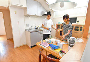 入居する女性たちが使うキッチンで食器を準備する「BONDプロジェクト」のスタッフら=東京都練馬区で(由木直子撮影)