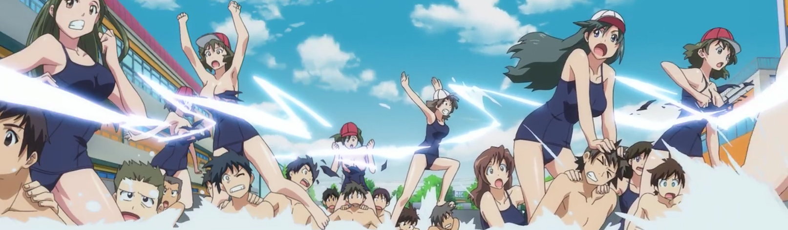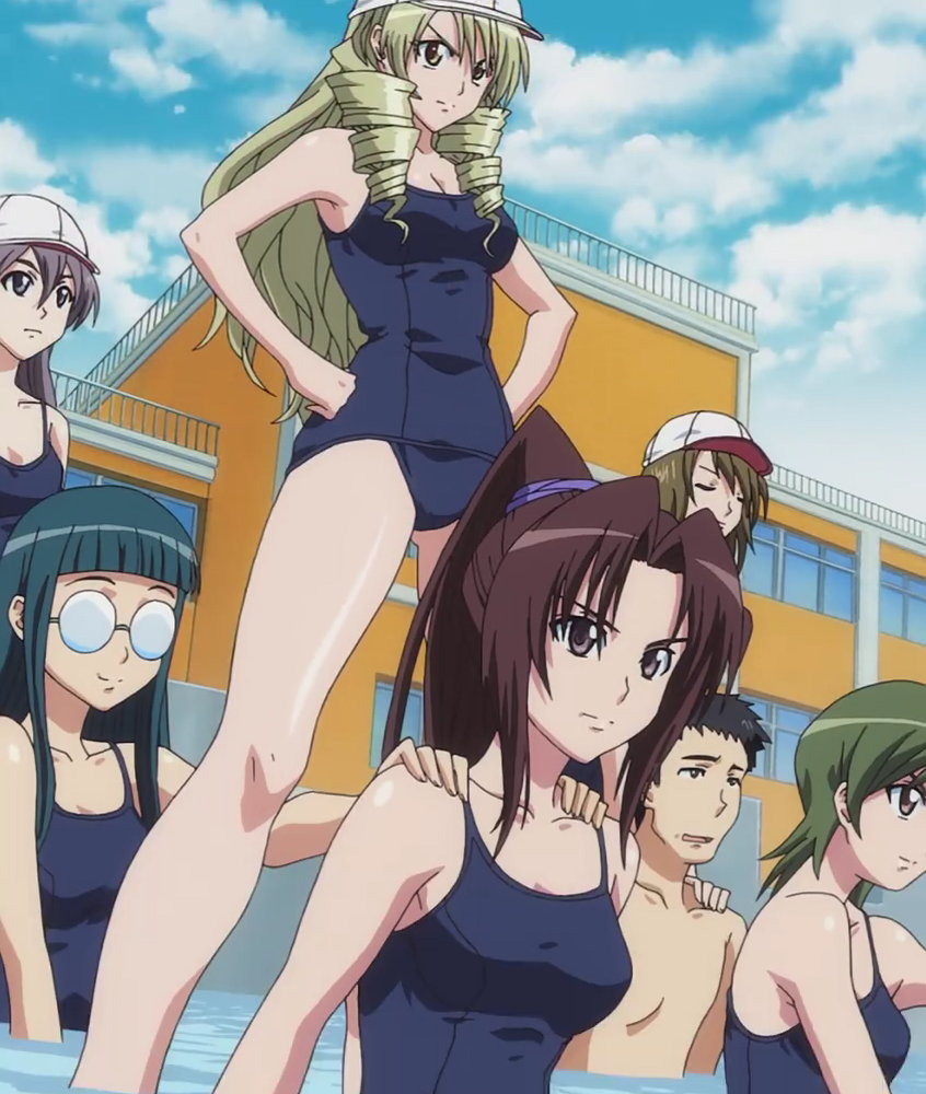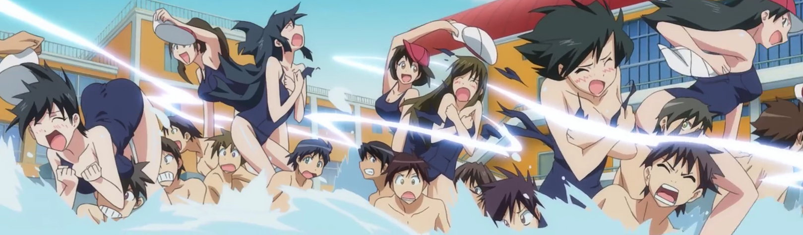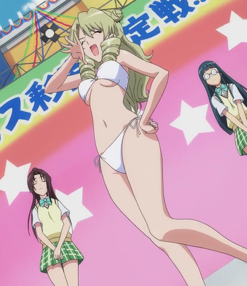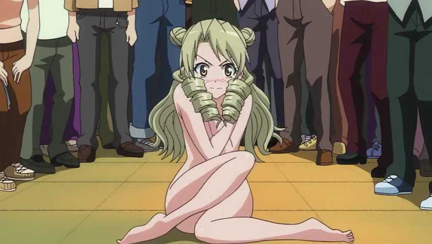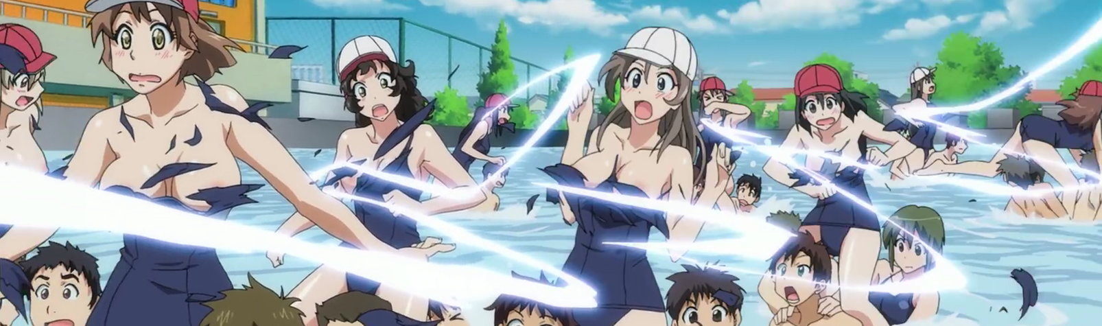 特製水着カッター扇子(天条院グループ開発)により、水着を引き裂かれる女子生徒たち。