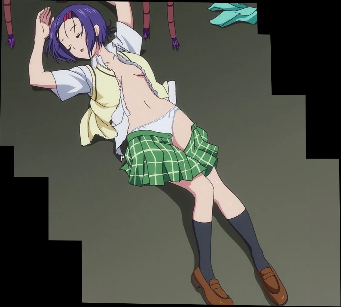 制服が破れて横たわる春菜。上半身は半裸、下半身はスカート半脱げパンチラ。