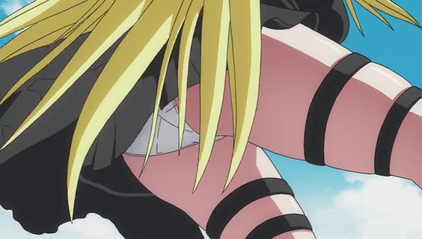 地上へと降下中、スカートが捲れてパンツ丸見えのヤミ。