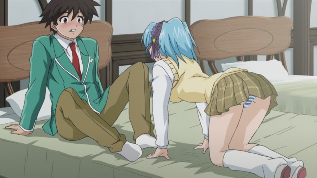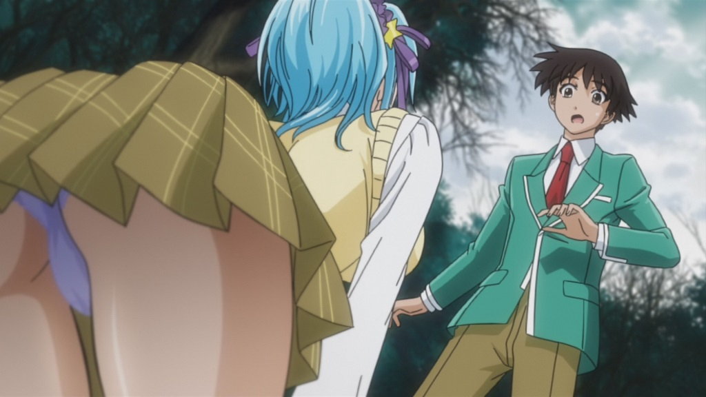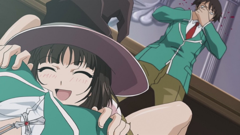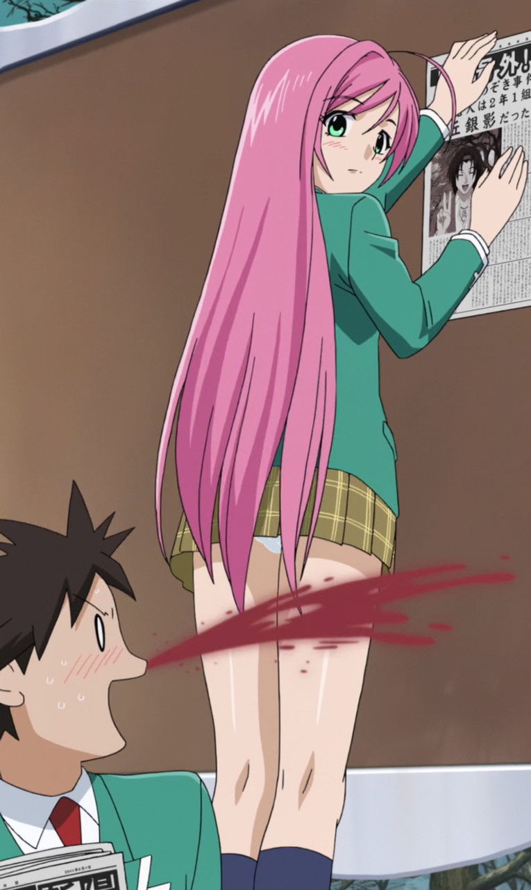 萌香のスカート内部を見て、鼻血を出す月音。