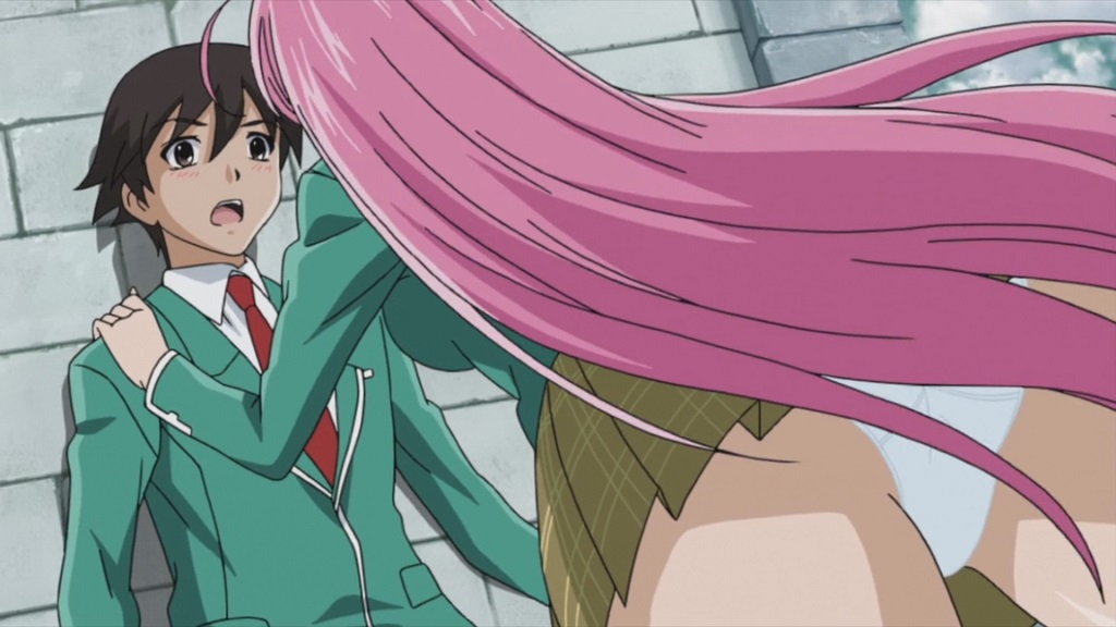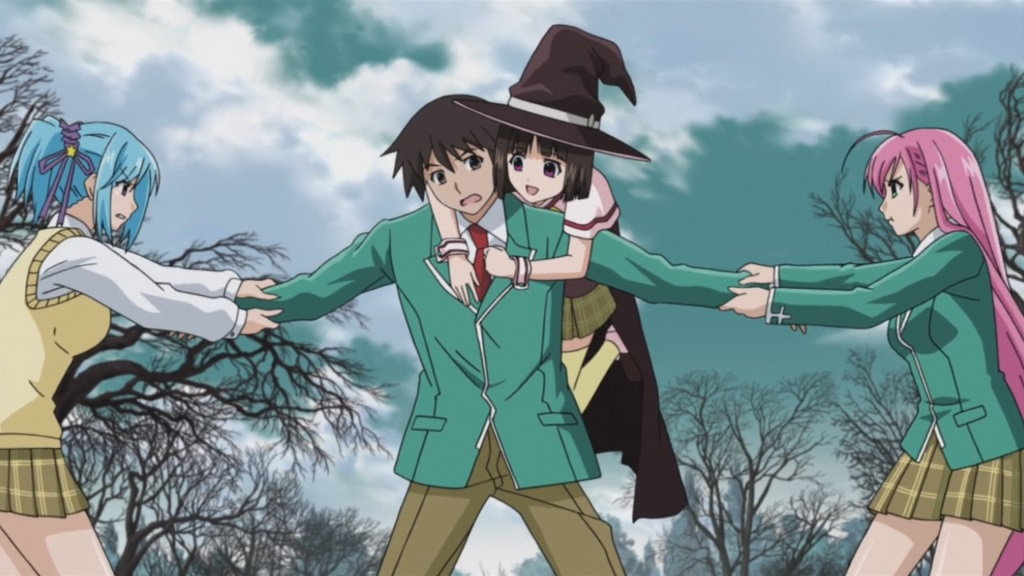 登校中の月音を奪い合う、パンツ全開の萌香、胡夢、紫。