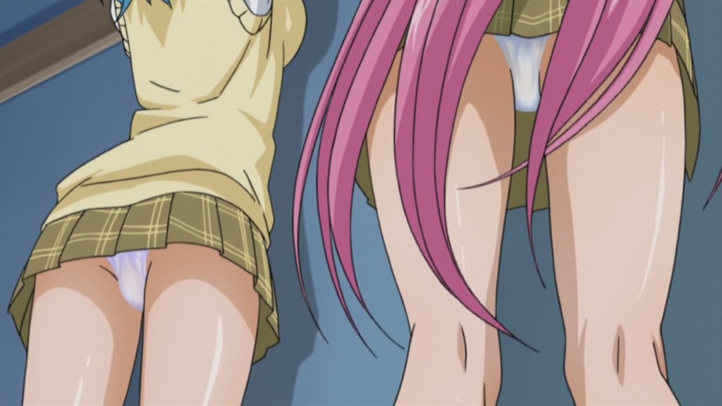 壁に貼り紙をする萌香と胡夢のパンチラ。