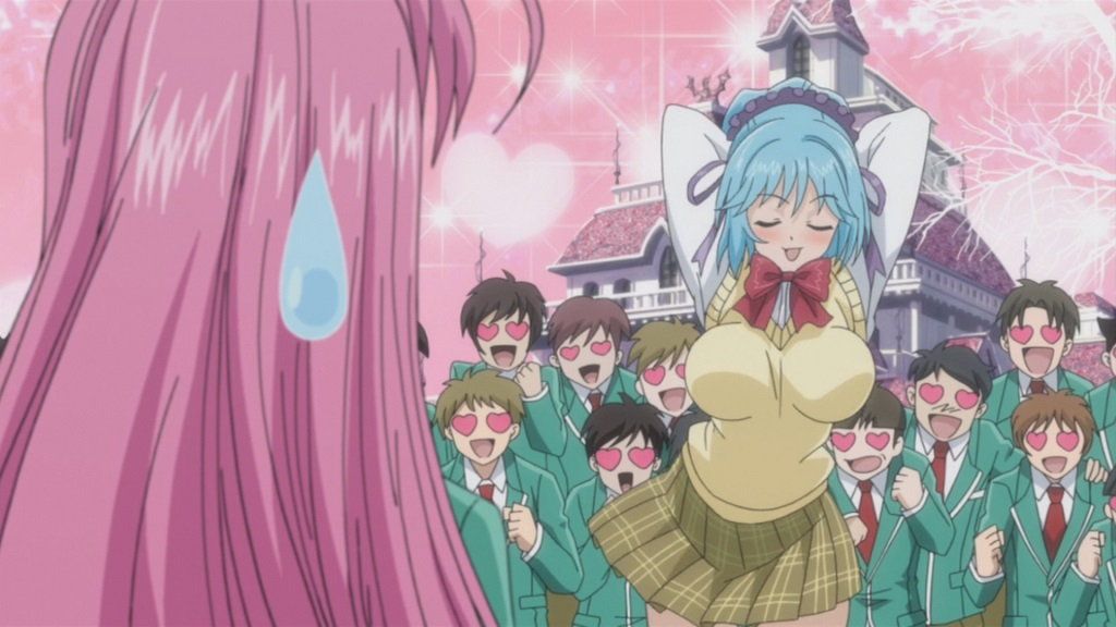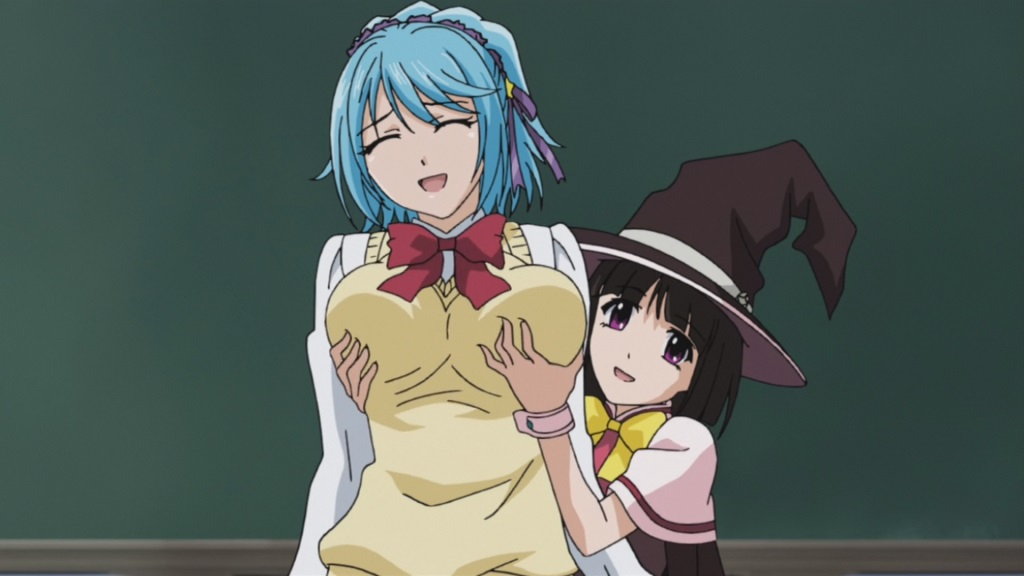 通学途中の月音に対し、巨乳を武器に色仕掛けに出る胡夢。
