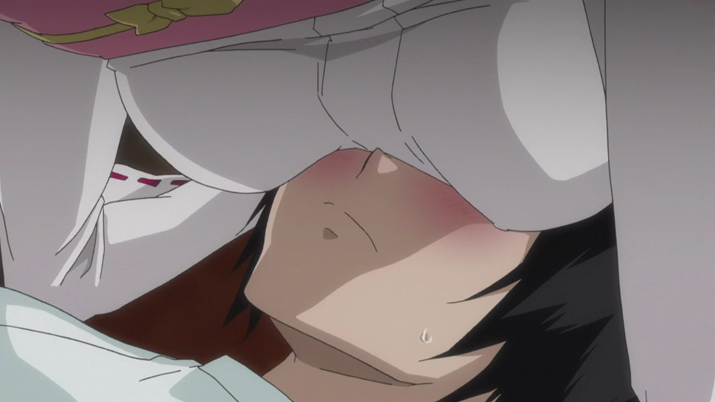 皆人の顔の上に接触する結の乳。
