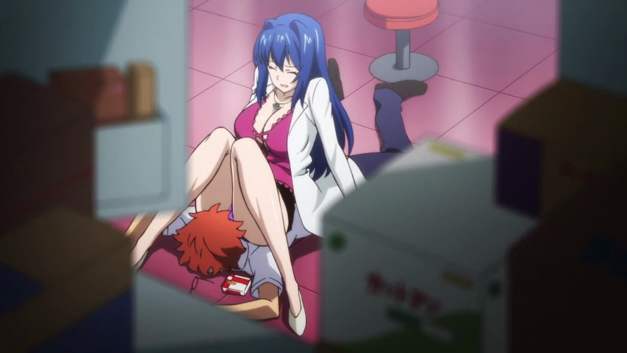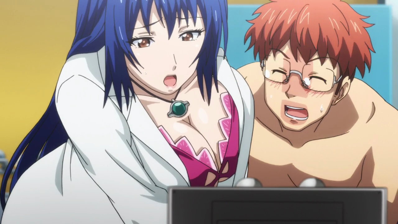 春恋のおっぱいに顔が埋もれるタケルと、スカートが破れてパンスト越しのパンツ丸見えの春恋。