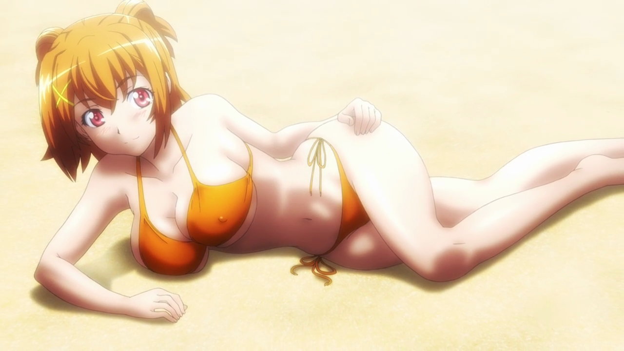 砂浜に寝そべるビキニのイナホ。