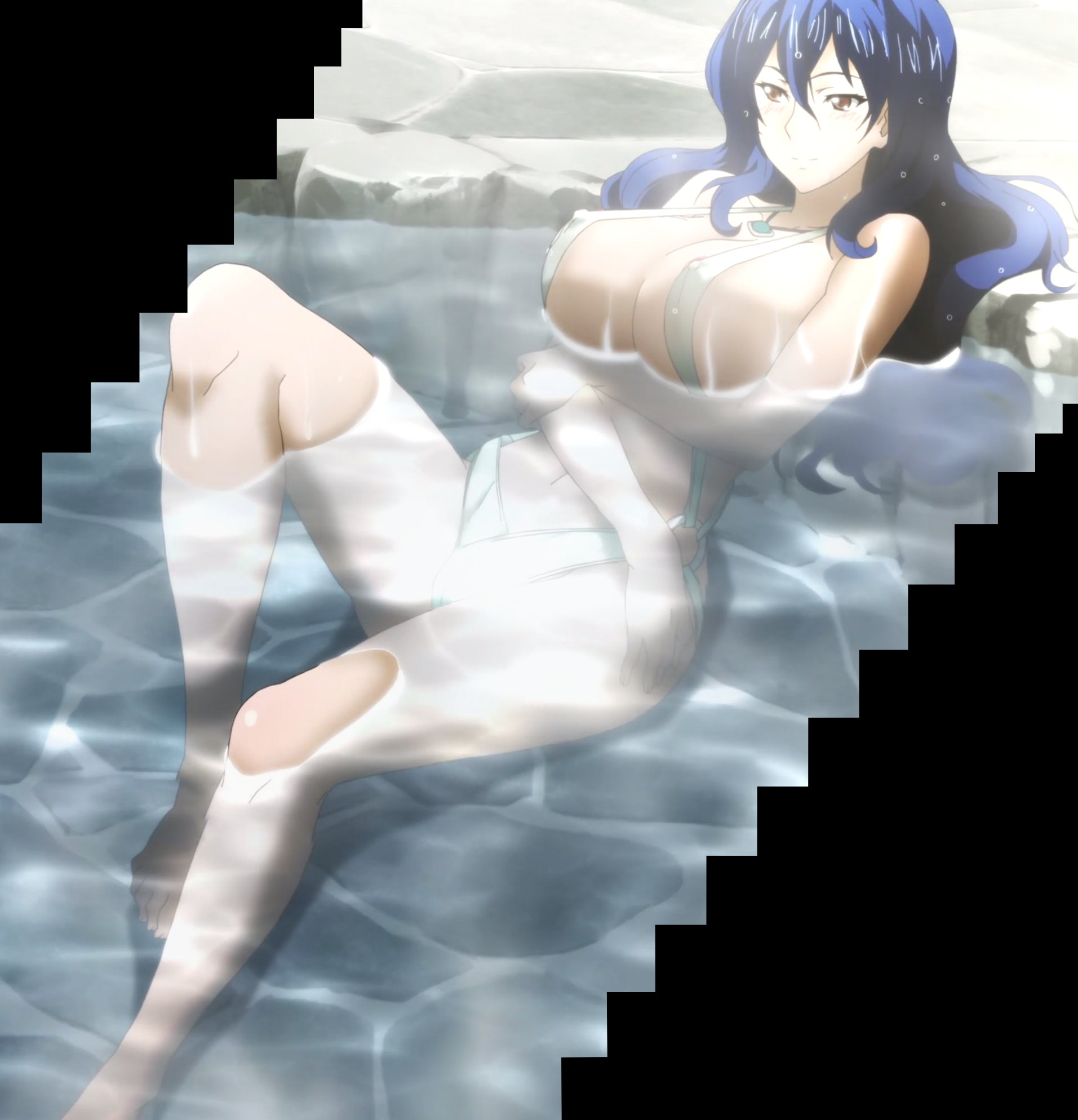 水着姿で温泉入浴中のコダマ、イナホ、春恋、秋、アズキ、穣華、季美、楓蘭。