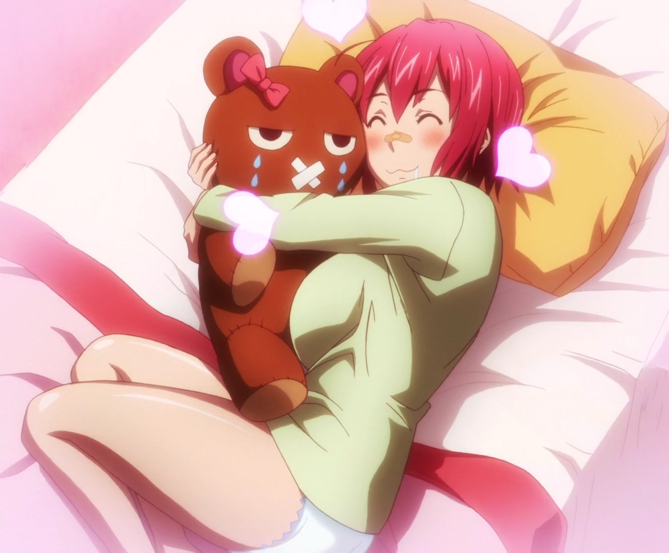 縫い包みを抱え、上半身パジャマ、下半身パンツだけで寝そべるアズキ。