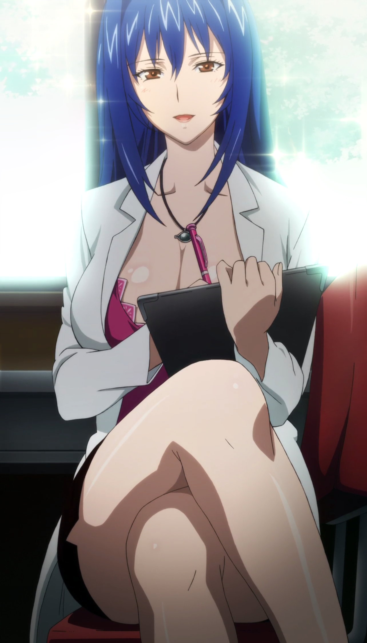 巨乳美脚保健医・二条秋の生脚と胸の谷間。