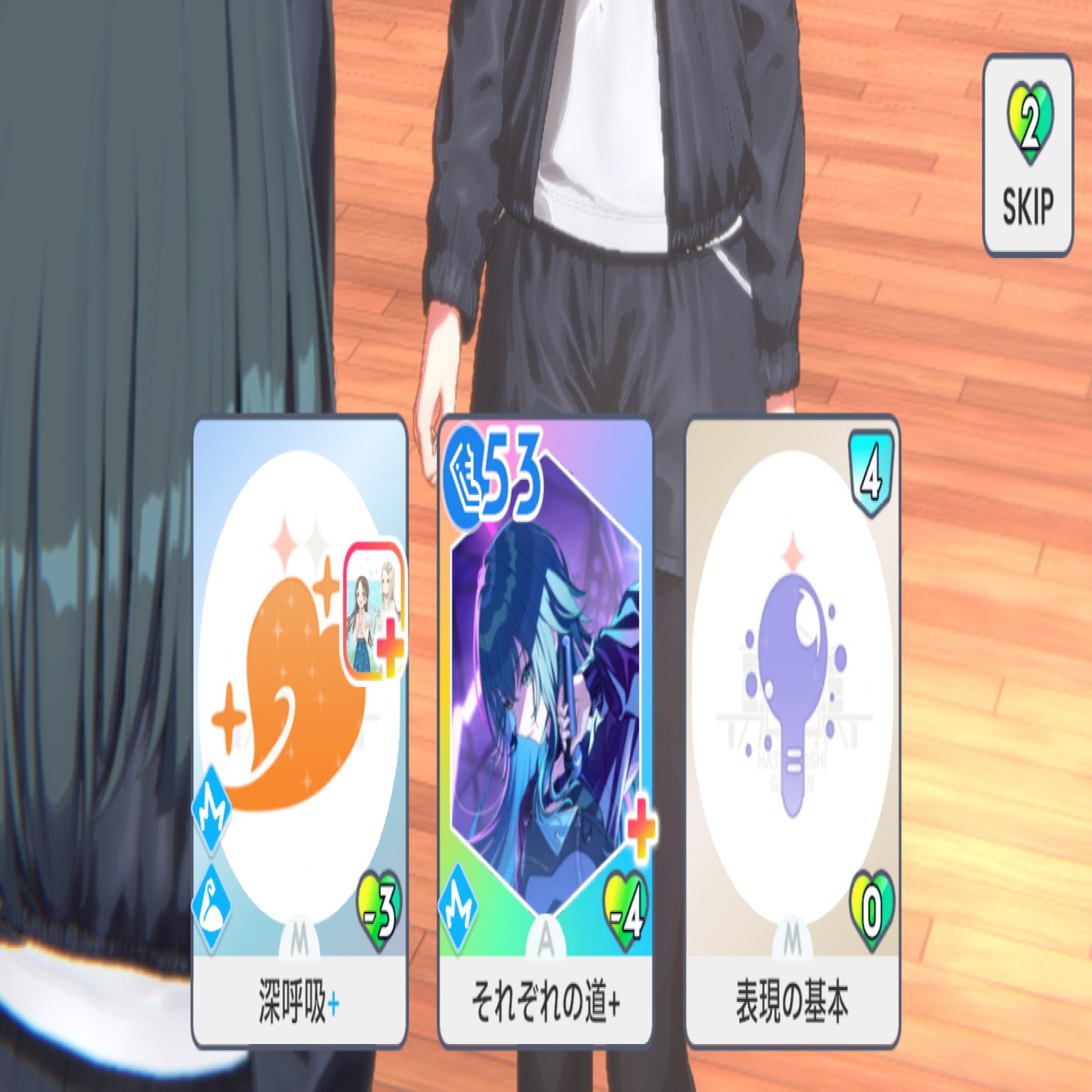 レッスン中のカード使用画面も、大きいアイコンによってカードの種類を示しつつも背景色の差別化でレア度(=カードの重要度)を明示しているため、どのカードを使えばいいのかがかなりわかりやすく表示できている画面といえるでしょう。