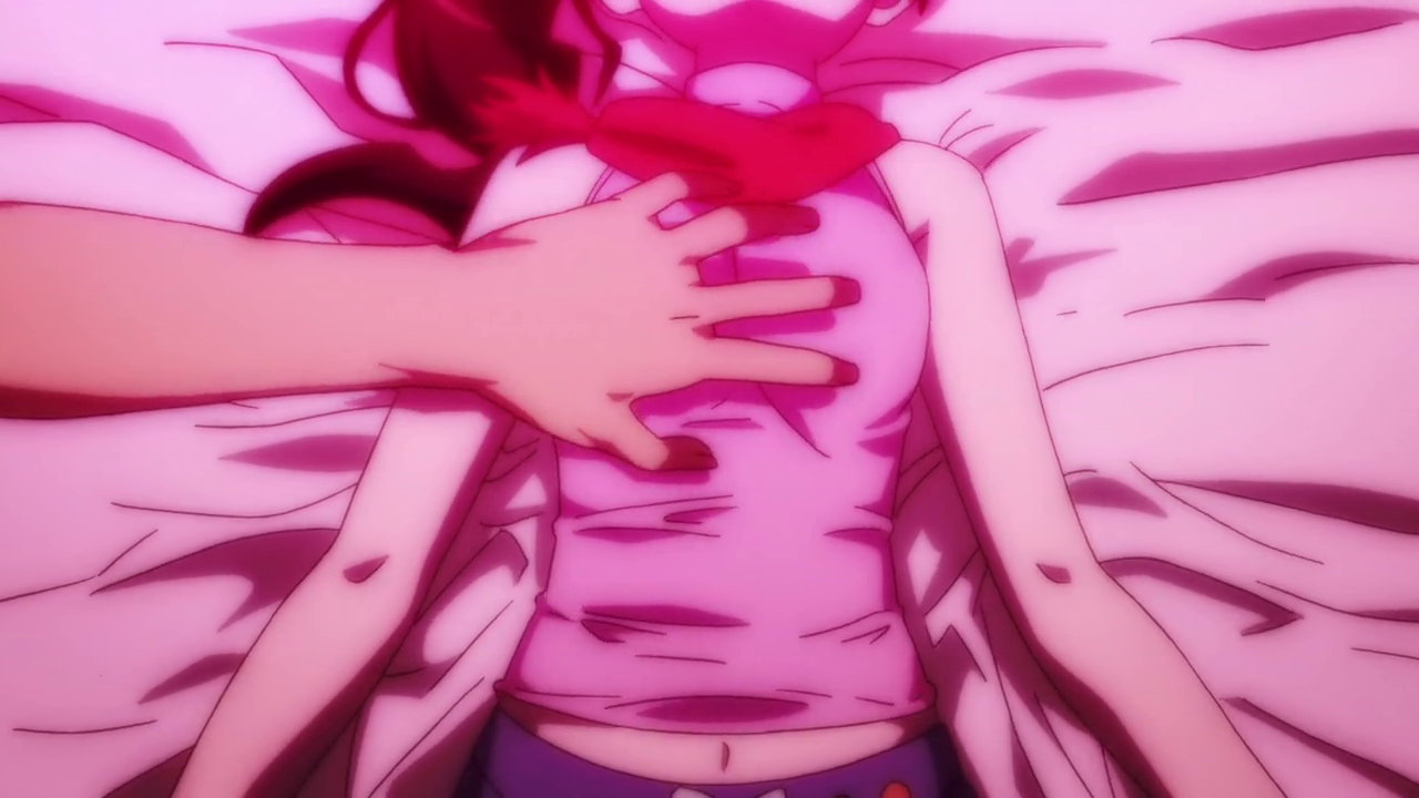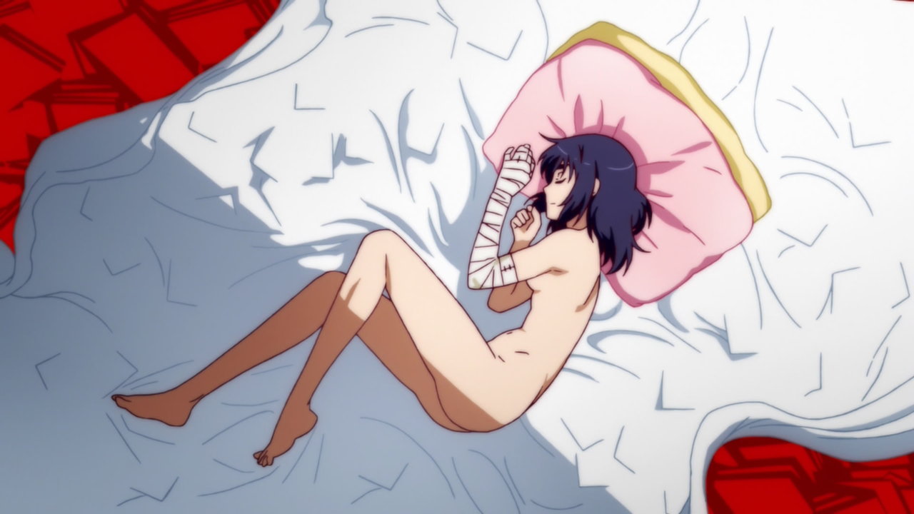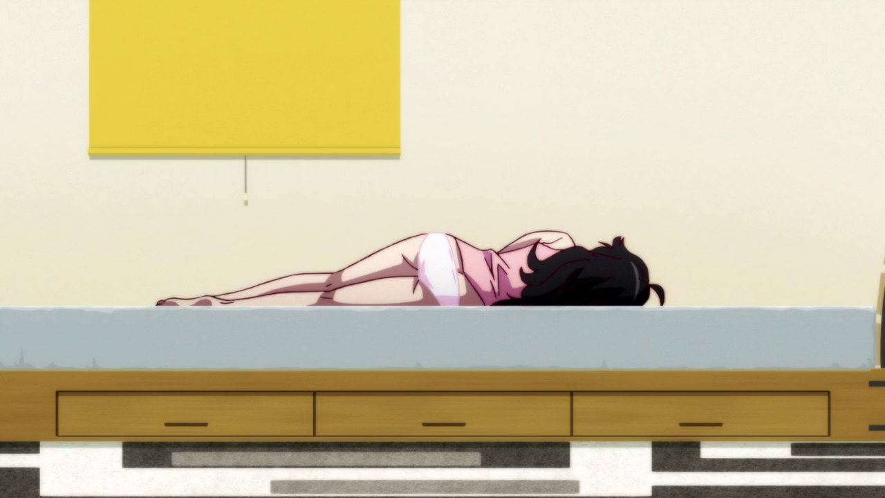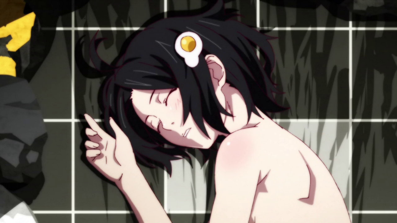 甦生後、上半身半裸状態で横たわる月火。