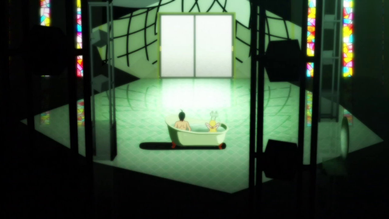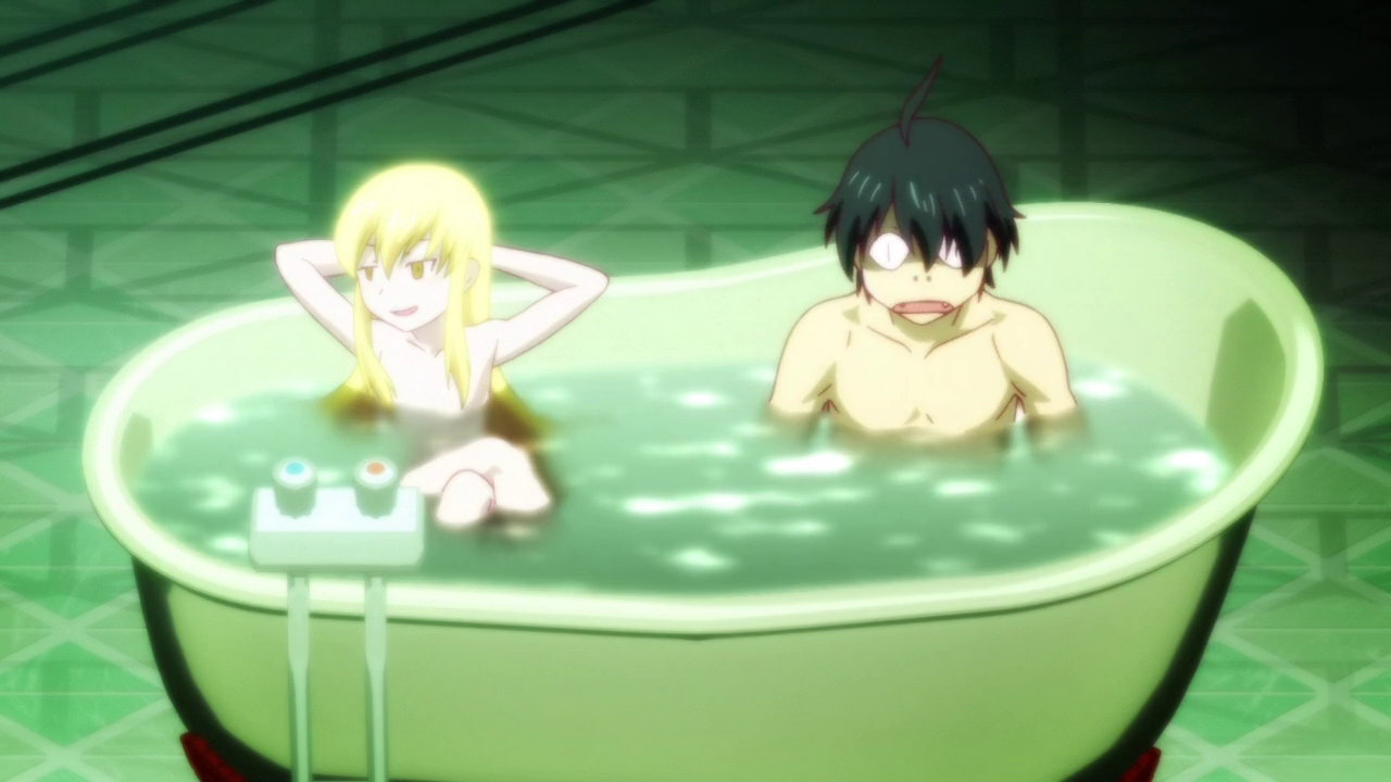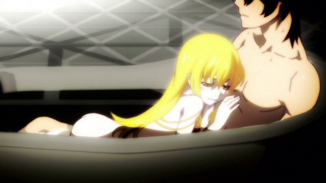 暦と共に湯船に浸かる忍。