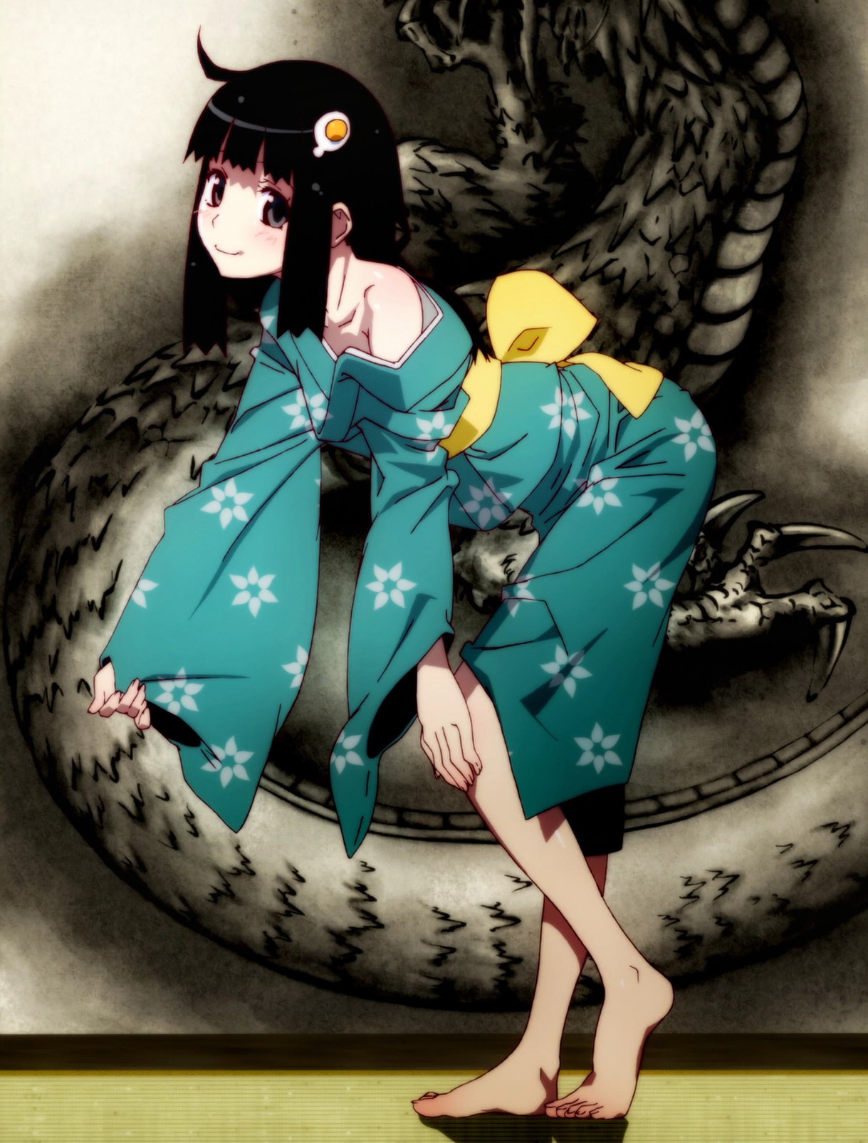 着物姿の月火の肩出し・生脚・裸足。