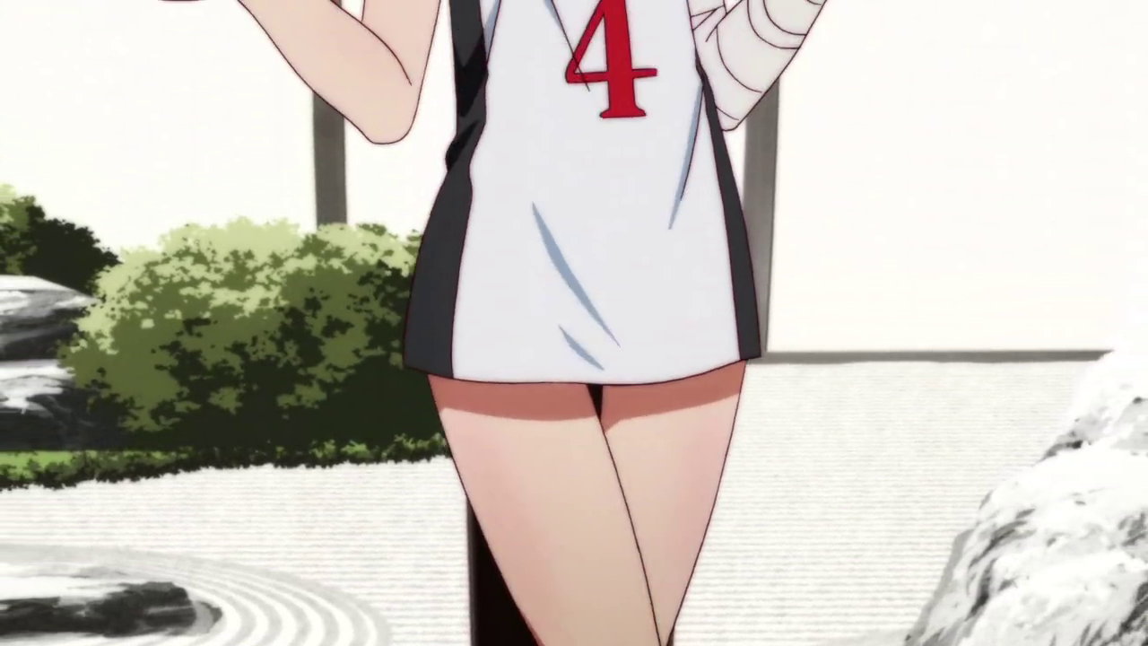 バスケ選手服を着た駿河。ホットパンツが隠れて、下を穿いていないように見える。