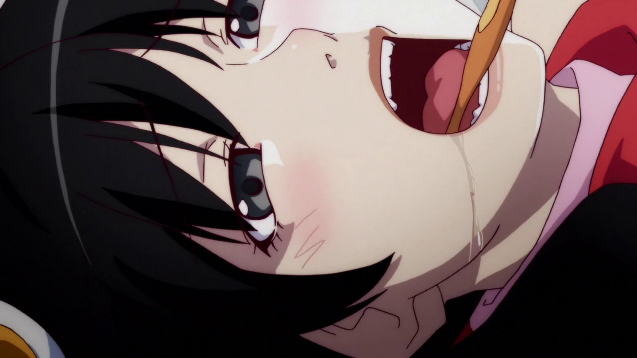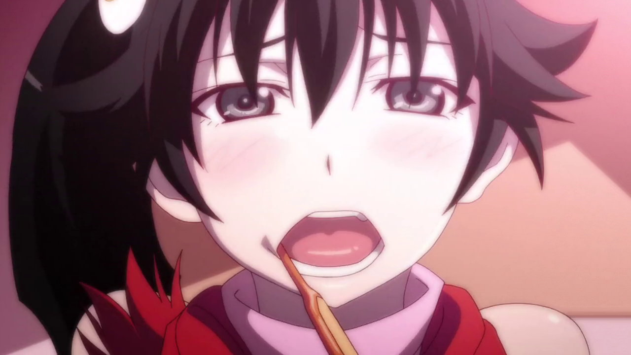 火憐の口腔に歯ブラシを挿入する暦。