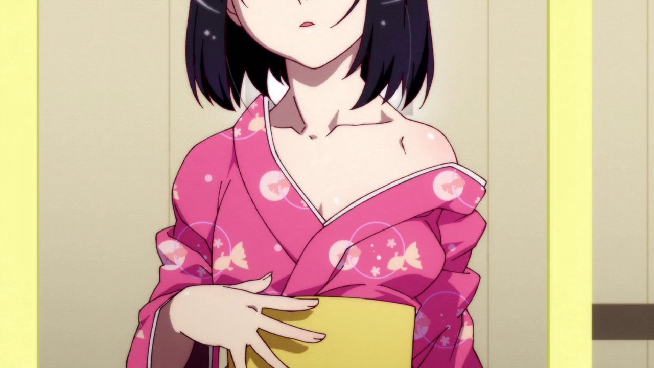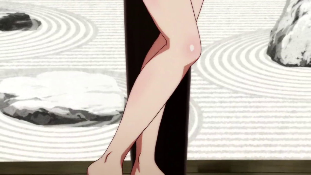 浴衣が開けて、太腿と肩をチラ見させる月火。