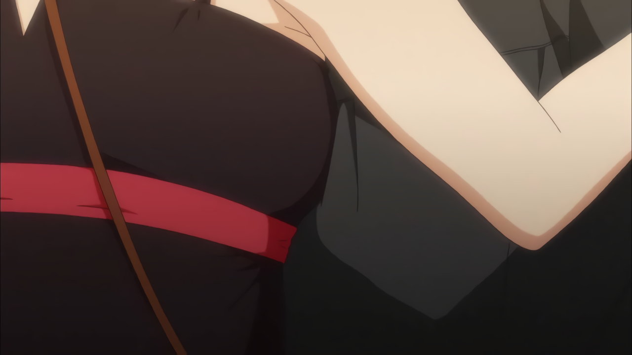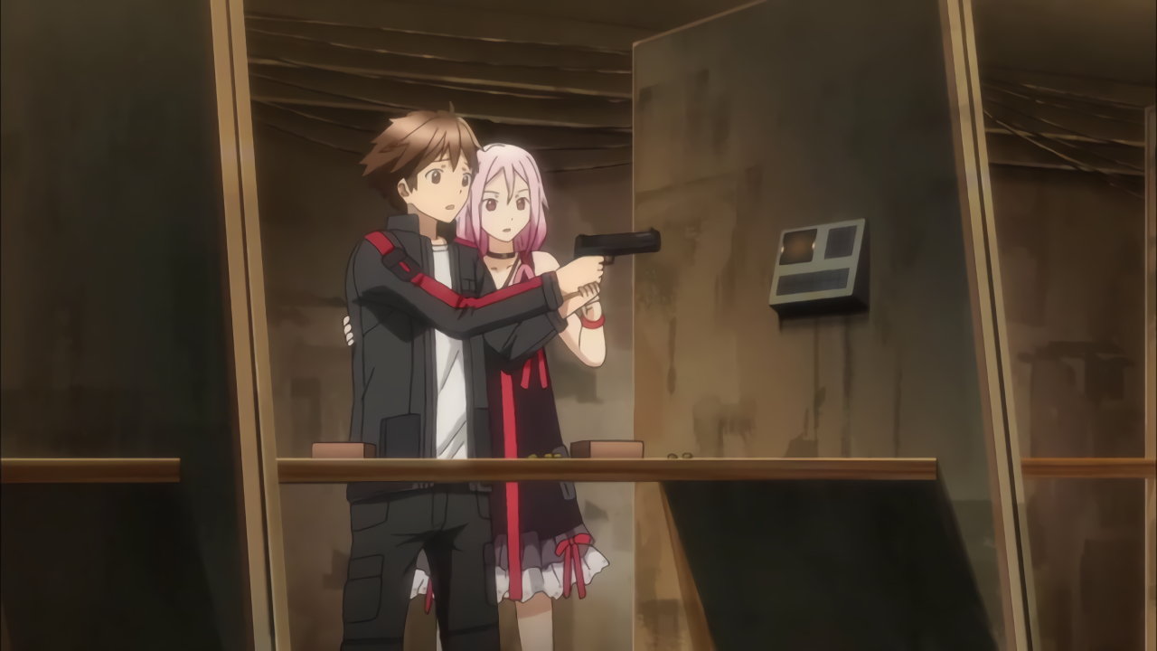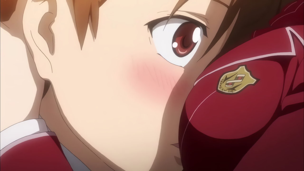 射撃方法を指導中、集の背中に胸を密着させるいのり。